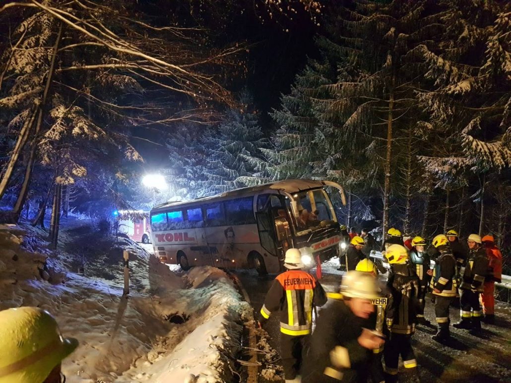 Ein Bus ist wegen Schneeglätte mit der Hinterachse in den Graben gerutscht. Da der Bus quer über der Fahrbahn stand, wurde die Straße komplett gesperrt. Die Unfallstelle wurde von der Feuerwehr Ederlsdorf und der Feuerwehr Erlau ausgeleuchtet. Das Herausziehen des Busses wurde durch ein Bergungsfahrzeug der Firma Paul und einem Kran der Firma Saller durchgeführt. Die sechs Fahrgäste, die in dem Bus waren, wurden mit dem Kombi der Feuerwehr Ederlsdorf nach Haar gefahren.